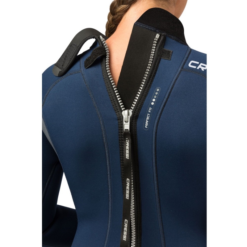 Der Fast 3mm hat einen ergonomisch geformten Hals mit einem 120º nach vorne abgewinkelten Design, das der natürlichen Positionierung des Halses folgt und eine bequeme Passform bietet. Ein breiter und hoher Klettverschluss sichert den Kragen fest, um ein Umschlagen bei Kopfbewegungen zu verhindern. Der hochwertige YKK-Rückenreißverschluss ist mit einer breiten GlideSkin-Platte unterlegt, die eine zusätzliche Abdichtung schafft, die das Eindringen von Wasser minimiert und den Wärmeschutz im Rückenbereich verbessert. Die Knie sind mit einer Anti-Abrieb-Beschichtung verstärkt, die vor wiederholten Bewegungen und dem Kontakt mit rauen Oberflächen schützt, ohne die Flexibilität des Neoprens im Kniebereich zu beeinträchtigen. Mit seinem maßgeschneiderten italienischen Design und seiner leistungsorientierten Konstruktion ist der Cressi Fast 3mm ideal für Warmwasserabenteurer, die einen bequemen und praktischen Neoprenanzug suchen.