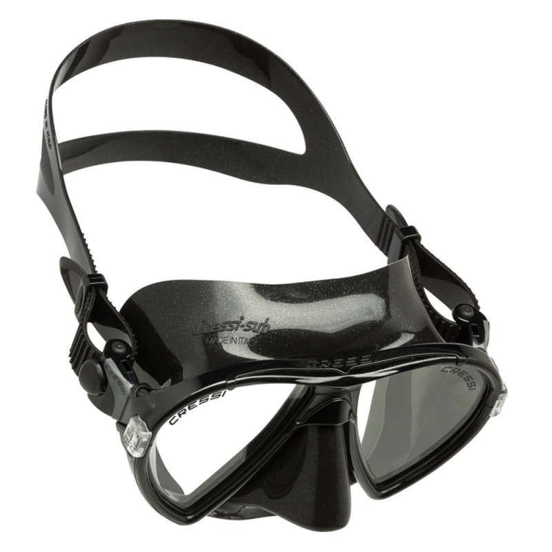 Das patentierte Konzept der geneigten Gläser und ihrer speziellen „umgekehrten Tropfenform“ wird hier weiterentwickelt. Die Gläser werden so nah wie möglich an den Augen platziert, für eine maximal mögliche Vergrößerung des Sichtfeldes. Die weiche Silikonschürze hat ein neues Profil und einen breiten Dichtungsring für hervorragenden Halt und beispiellosen Komfort. Das Innenvolumen der Maske ist außerordentlich gering, geringer als bei vielen Freitauchermodellen, und das Gewicht ist ausgesprochen niedrig. Zwei in das Kopfband integrierte Druckschnallen ermöglichen eine schnelle und genaue Einstellung des Maskenbandes.
