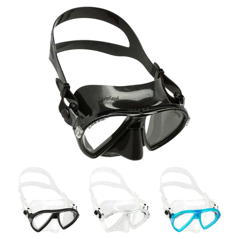 Das patentierte Konzept der geneigten Gläser und ihrer speziellen „umgekehrten Tropfenform“ wird hier weiterentwickelt. Die Gläser werden so nah wie möglich an den Augen platziert, für eine maximal mögliche Vergrößerung des Sichtfeldes. Die weiche Silikonschürze hat ein neues Profil und einen breiten Dichtungsring für hervorragenden Halt und beispiellosen Komfort. Das Innenvolumen der Maske ist außerordentlich gering, geringer als bei vielen Freitauchermodellen, und das Gewicht ist ausgesprochen niedrig. Zwei in das Kopfband integrierte Druckschnallen ermöglichen eine schnelle und genaue Einstellung des Maskenbandes.