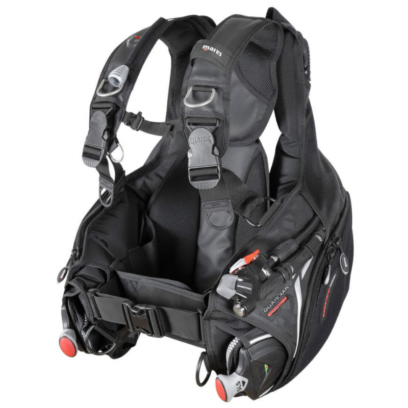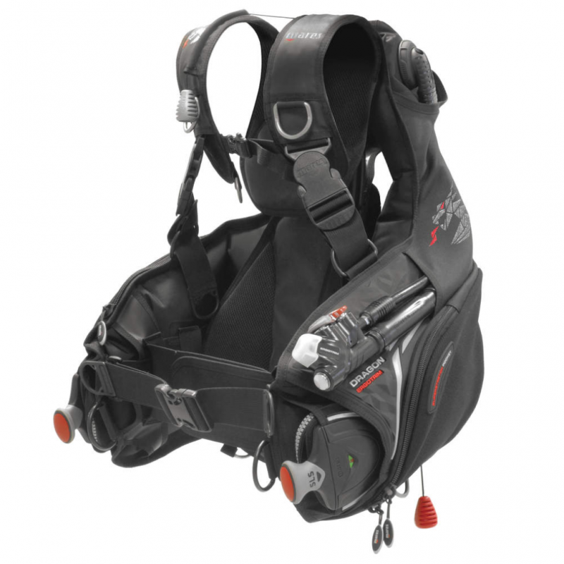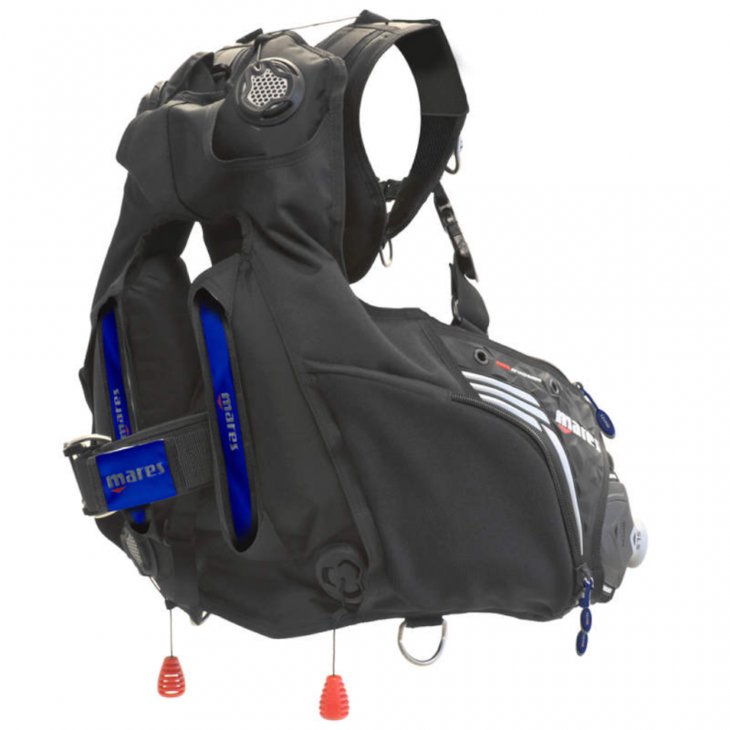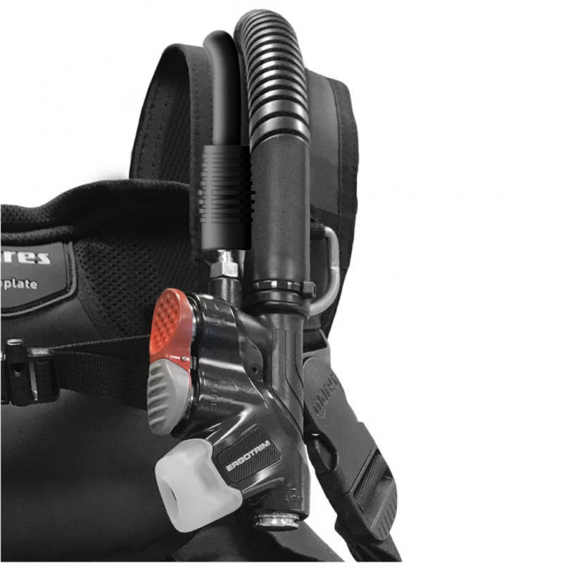 Das war 2001. Im Jahr 2021 übertrifft sich Mares selbst und führt die Version 2.0 dieser Technologie ein. Wir nennen es nun ERGOTRIM, da wir die pneumatische Entlüftung mit dem „Standard“-ERGO-Inflator kombinieren. Die neue Variante lässt die Luft wie ein normaler Inflator hinein und hinaus, hat aber eine zusätzliche Taste, um die pneumatischen Ventile anzusteuern. Über den Tasten zum Be- und Entlüften des Jackets befindet sich ein Wippschalter, der verhindert, dass Sie beide gleichzeitig betätigen. Wenn Sie als Ausbilder die Standardskills vorführen möchten, tragen Sie den ERGOTRIM als normalen Inflator an der linken Schulter. Für alle anderen haben die mit ERGOTRIM ausgerüsteten Jackets eine Manschette im hinteren Teil des Auftriebskörpers, die den Faltenschlauch unter der linken Schulter hindurchführt und ihn an einer Halterung am oberen Ende des linken Seitenteils positioniert. Ergonomisch gesehen ähnelt sie dem Original, hat aber eine um 40 % höhere Durchflussrate beim Belüften, ist besser in das Jacket integriert und kann im Notfall zum Belüften einfach vom Halter abgezogen, zum Mund geführt und oral belüftet werden. Das Endergebnis ist ein sehr stromlinienförmiges Jacket, welches unter allen Umständen mit einer Hand bedient werden kann. Es bietet eine freie linke Schulter und die Gewissheit, dass man seine Position im Wasser nicht ändern muss, um die Luft aus dem Jacket zu lassen.