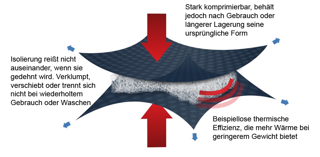 Climashield® Apex™ ist eine einzigartige Isolierung aus dehnbaren Fasern mit Röhrenquerschnitt – „unzerstörbare Wärme“ – ist leicht, sehr warm, beständig gegen Wäsche und Druck..