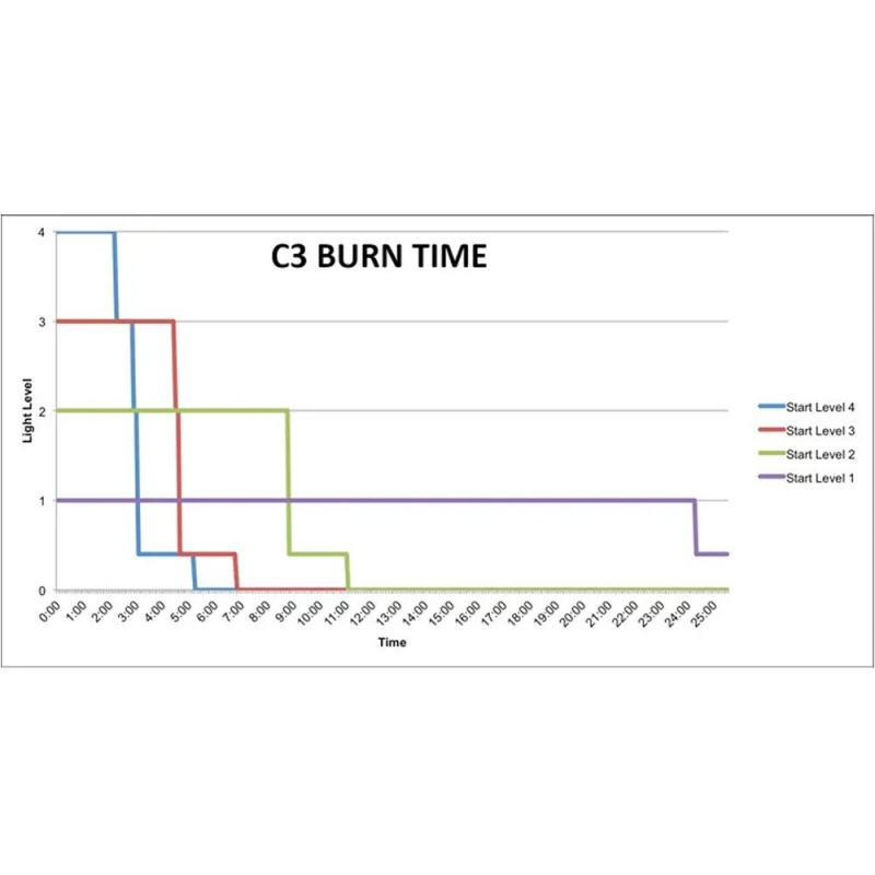 * Die Brenndauer variiert mit der Leistungsstufe und kann durch niedrige Temperaturen, Alter, übermäßige Nutzung usw. verkürzt werden.
