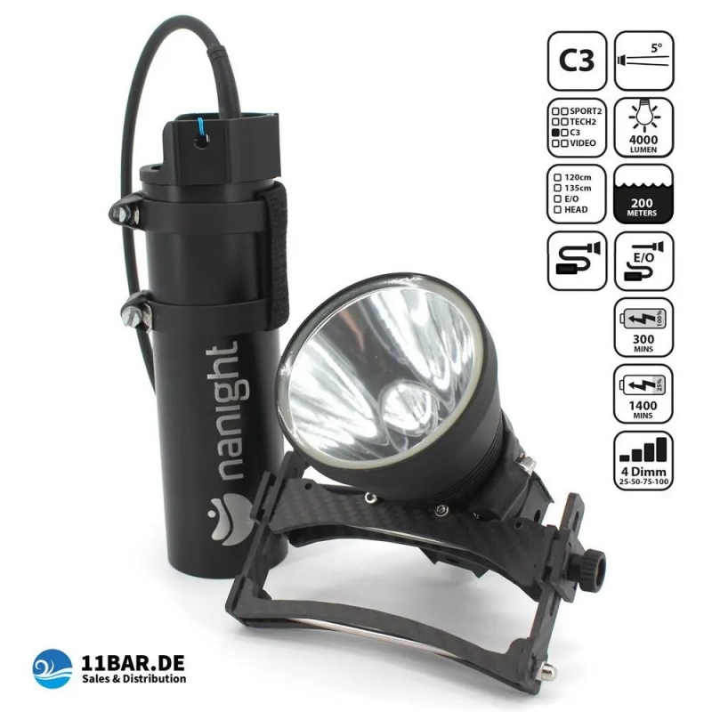 Nanight - Tauchlampe Cave 3 Sidemount mit 135cm Kabel - Farbe: Schwarz