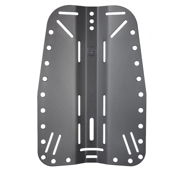Der besondere Entgratungsprozess von OMS eliminiert scharfe Kanten der Backplate und verhindert Abrieb und Schnitte an Gurten und BC's. Die Aluminium-Backplate wiegt nur 794 g (1,75 lbs) und beinhaltet Schlitze für einen 1" oder 2" (2,5 cm und 5 cm) breiten Schrittgurt, (2) Flaschenspanngurte und einen unteren Schlitz zur Aufnahme von Schellenbolzen von Doppelgeräten, die in der Mitte etwas außerhalb von 27,94cm (11") liegen. Die Aluminiumplatte hat eine harte, eloxierte Oberfläche, um Oxidation zu verhindern, und verfügt nun über zusätzliche Schlitze zur Befestigung von Flaschenspanngurten für die Einzelzylinderkonfiguration. Die Platte hat 22 Löcher für eine flexible Montage von Zubehör.