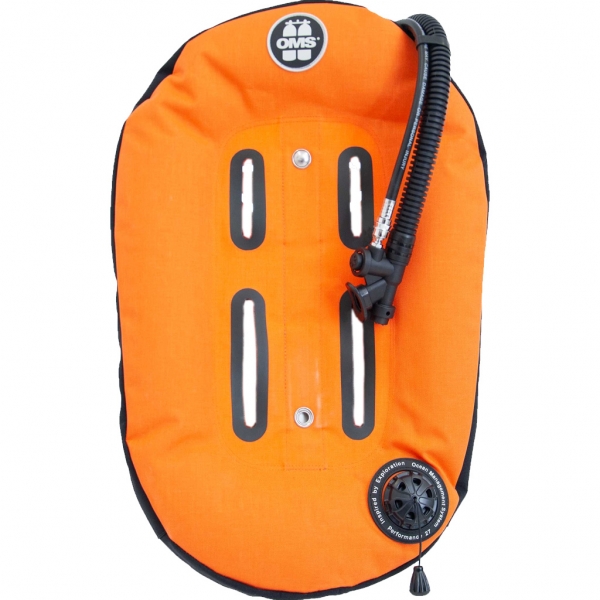Die OMS Performance Mono Wings sind ein klassischer Donut-Stil. Der Flügel hat einen in den Inflator integrierten Pull-Dump-OVP an der linken Schulter und einen OVP an der linken Hüfte und zwei Blasen. Die äußere Blase hat einen TPU-Laminat. Die zweite Blase ist ultraschallgeschweißt. Die äußere Blase hat einen YKK-Reißverschluss mit großen Zähnen.