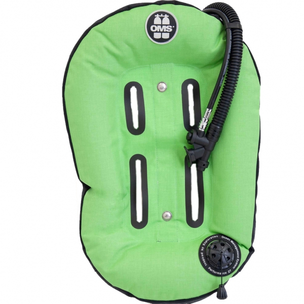 Die OMS Performance Mono Wings sind ein klassischer Donut-Stil. Der Flügel hat einen in den Inflator integrierten Pull-Dump-OVP an der linken Schulter und einen OVP an der linken Hüfte und zwei Blasen. Die äußere Blase hat einen TPU-Laminat. Die zweite Blase ist ultraschallgeschweißt. Die äußere Blase hat einen YKK-Reißverschluss mit großen Zähnen.