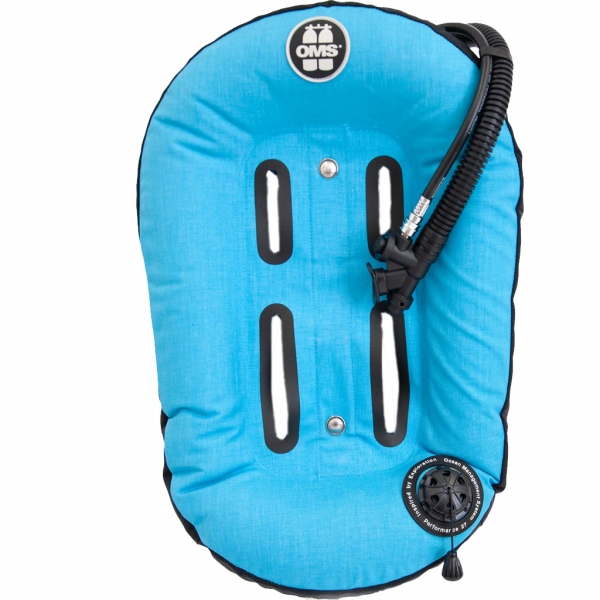 Die OMS Performance Mono Wings sind ein klassischer Donut-Stil. Der Flügel hat einen in den Inflator integrierten Pull-Dump-OVP an der linken Schulter und einen OVP an der linken Hüfte und zwei Blasen. Die äußere Blase hat einen TPU-Laminat. Die zweite Blase ist ultraschallgeschweißt. Die äußere Blase hat einen YKK-Reißverschluss mit großen Zähnen.