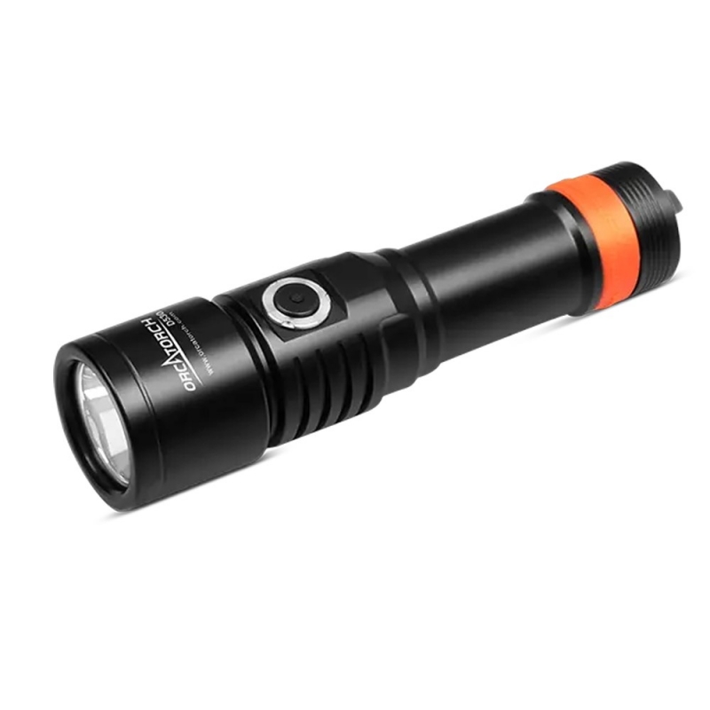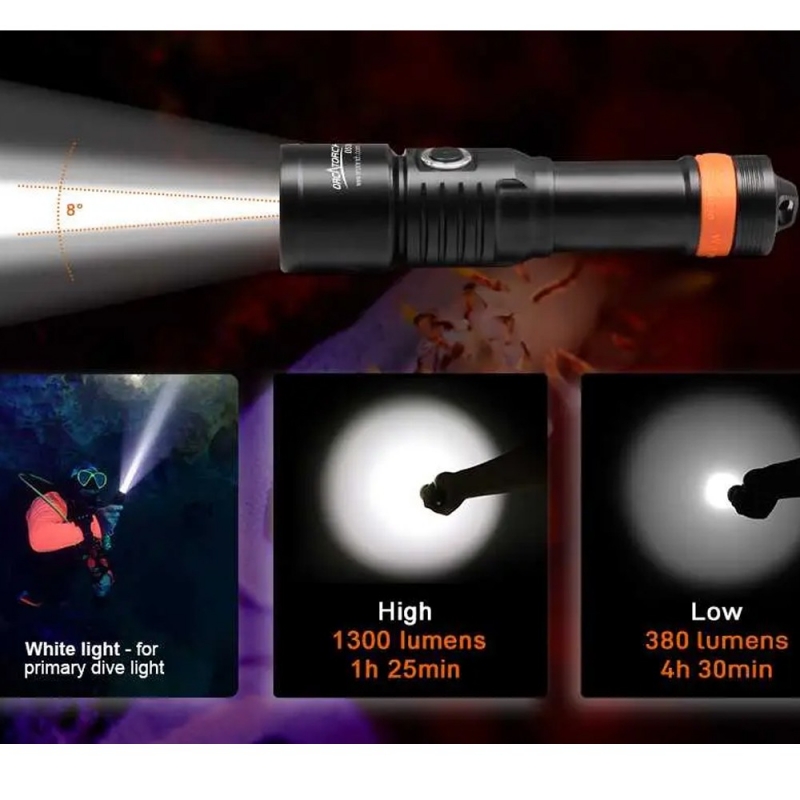 ORCATORCH D530 ist eine unverzichtbare Grundlampe für jeden Taucher. Die 1300-Lumen-Leistung und der 8-Grad-Superfokus-Strahlwinkel sorgen für einen konzentrierten Langstrahls chuss. Das Licht verwendet einen Seitensc halter aus Titan legierung, der 2 Beleuchtungs modi bietet, den Hoch modus von 1300 Lumen und den Niedrig modus von 380 Lumen, was eine einfache Bedienung unter Wasser ermöglicht. Die LED-Anzeige auf dem Schaltknopf informiert Sie auch über die verbleibende Batterieladung.